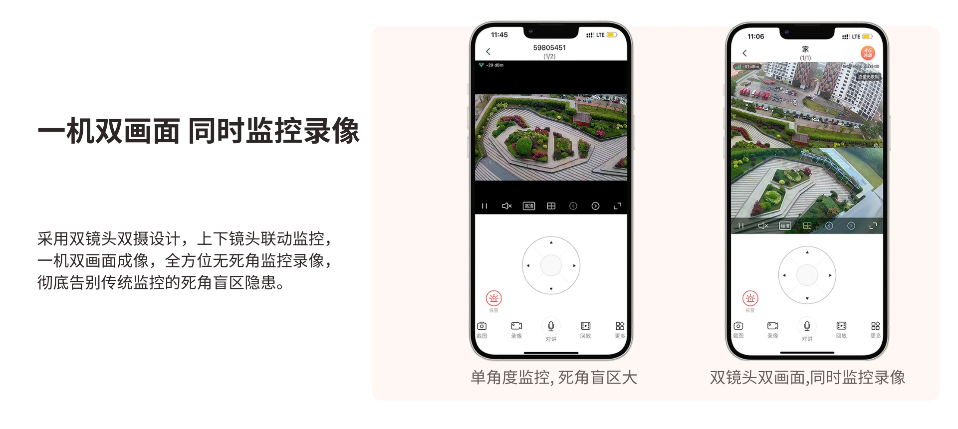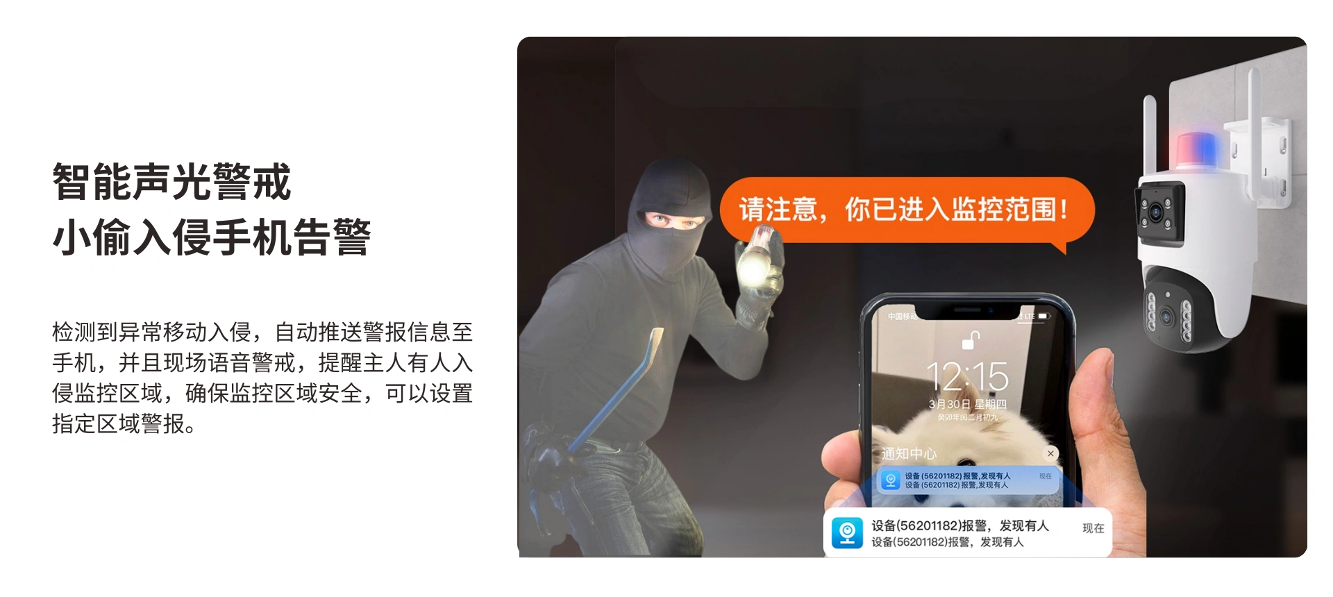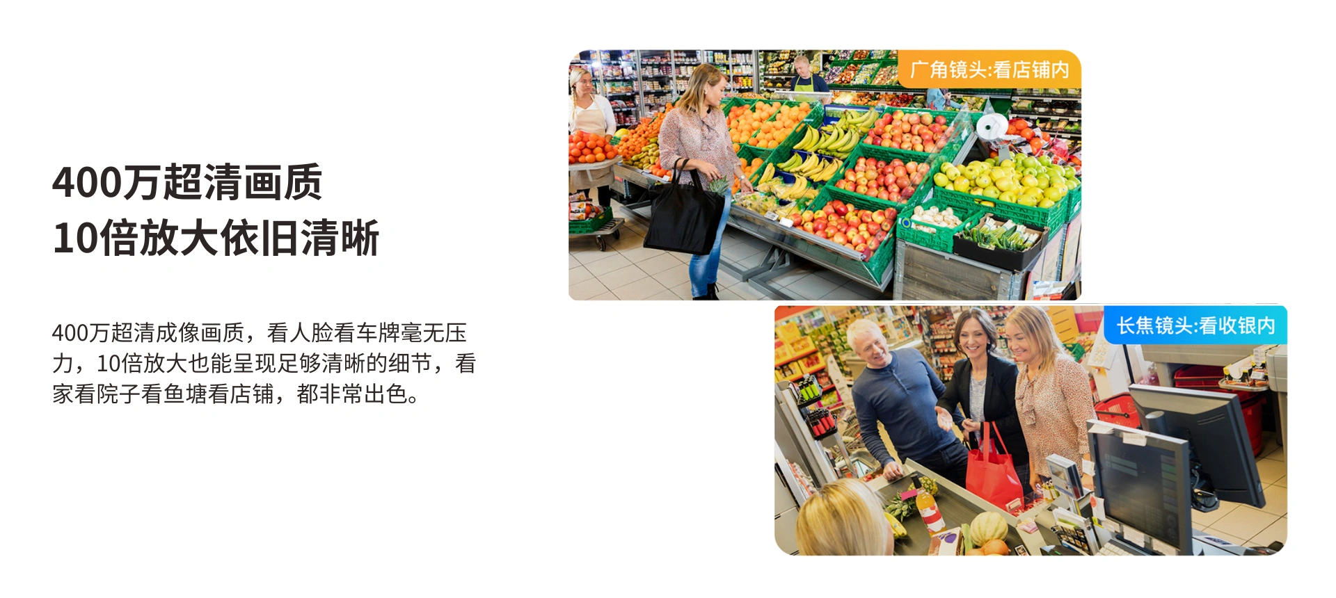 户外360°看护,10倍变焦,人形侦测。400W高清画质细腻,细节放大也能呈现足够精彩,一动一静,360°全景视野。