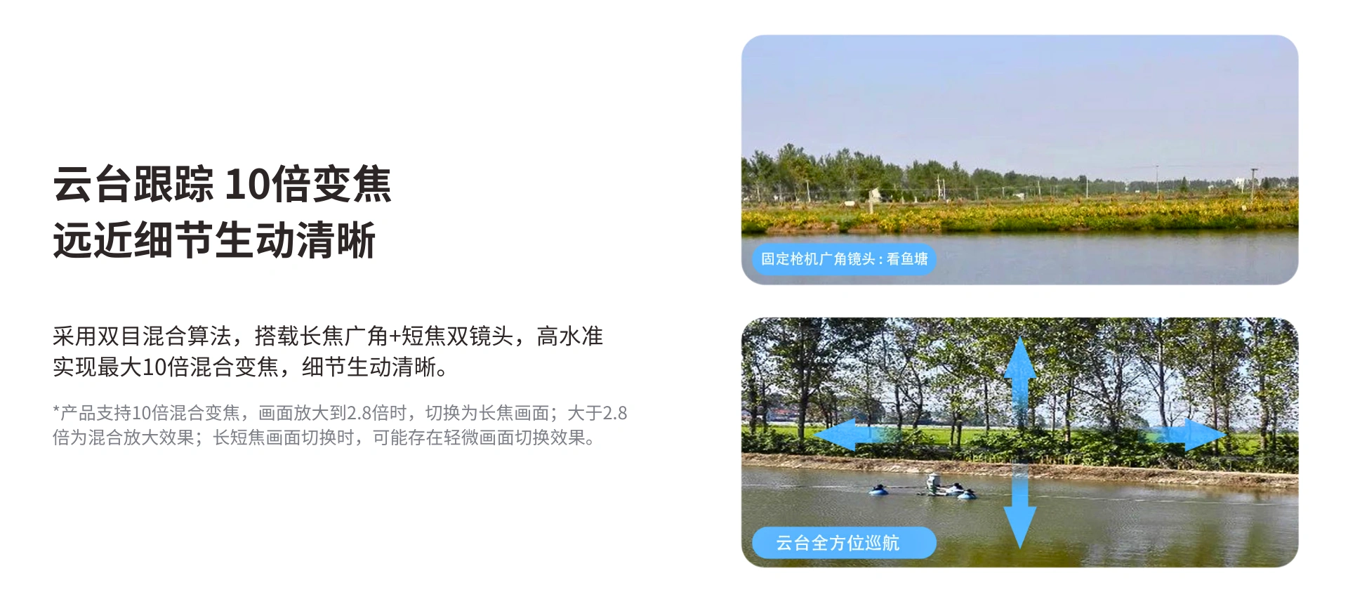 采用双目混合算法,搭载长焦广角+短焦双镜头,以及长焦广角三镜头,高水准实现,最大10倍混合变焦,细节生动清晰。