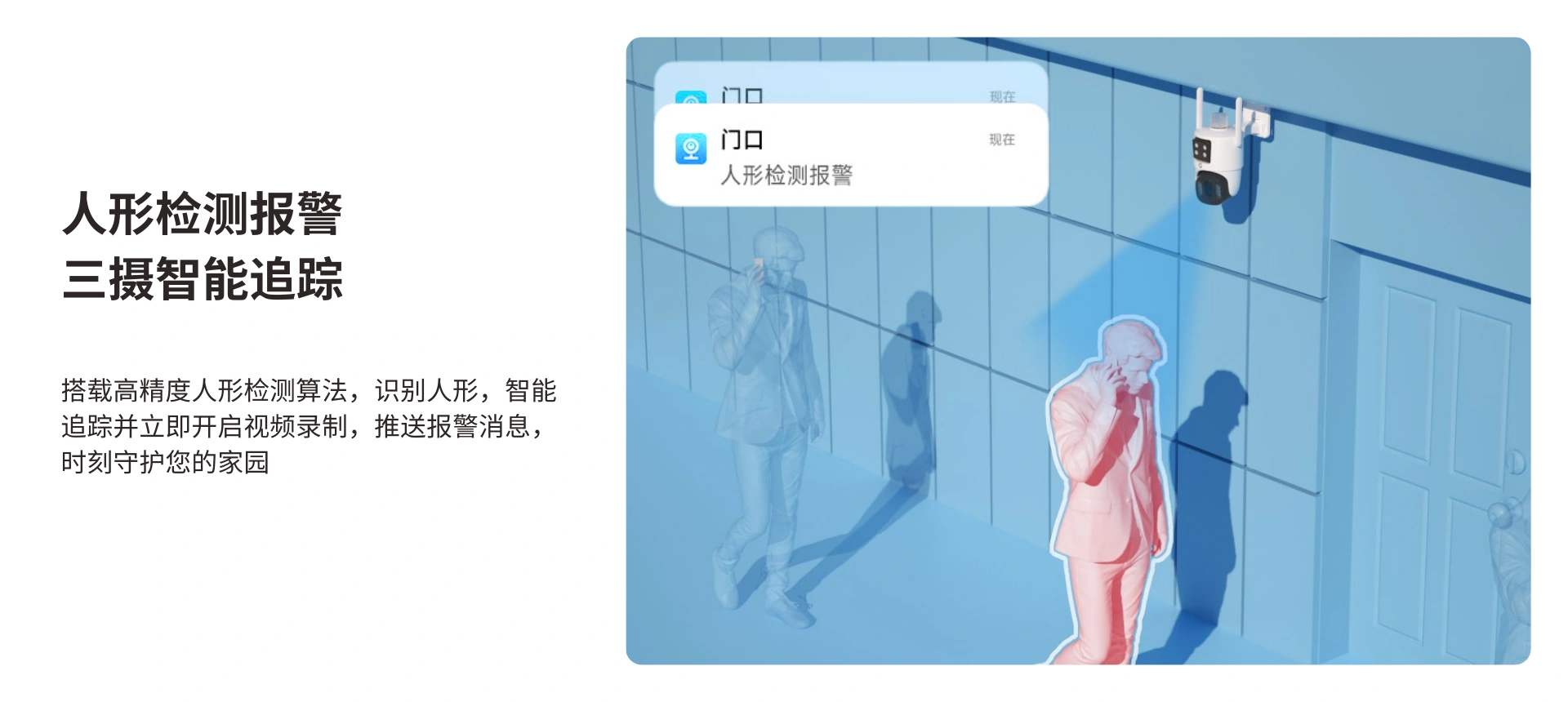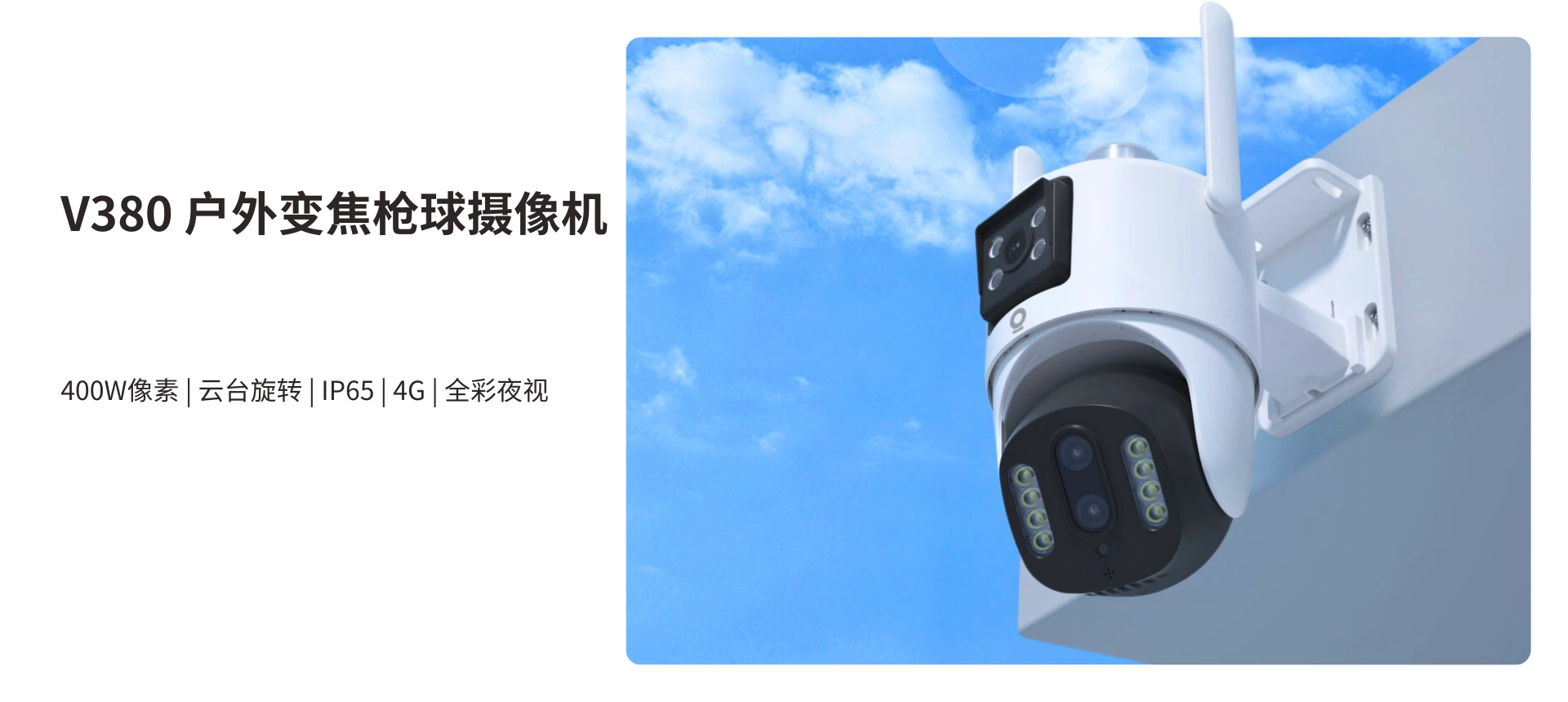 户外360°看护,10倍变焦,人形侦测。400W高清画质细腻,细节放大也能呈现足够精彩,一动一静,360°全景视野。